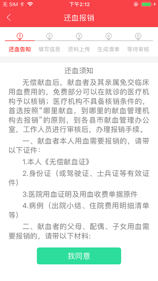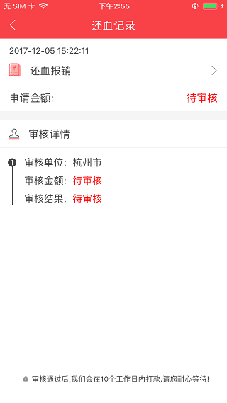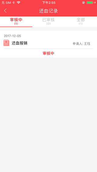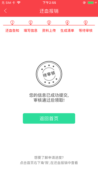 4. 还血报销申请完成后可在‘我’页面中还血记录中查看进度