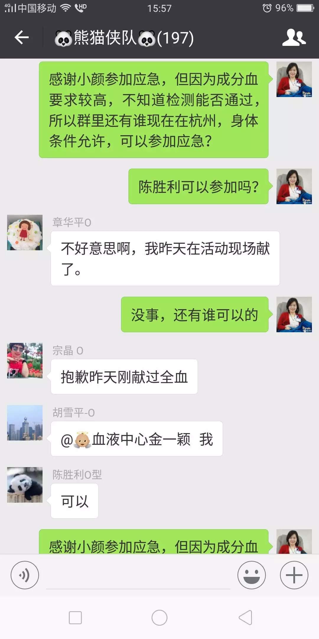 献血服务一科的招募人员第一时间通过微信群和电话进行招募。微信群里的稀有血型献血者颜照成立刻响应,第一个报名,而此时,他正在出差回杭路上。由于成分献血要求较为严格,为了保证100%采集成功,微信群里的献血报名还在继续。马上,胡雪平、陈胜利也报名响应,三位“熊猫侠”分头赶往www.48365365.com,力争第一时间到达。