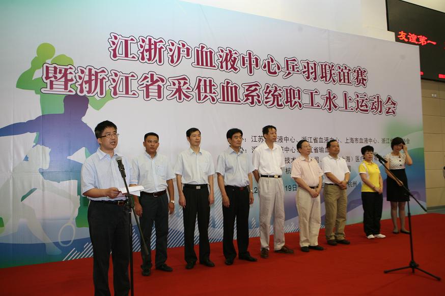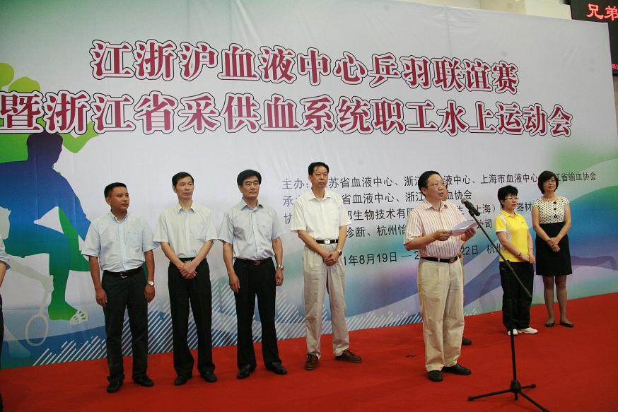 2011年8月20日,来自江浙沪三地采供血系统的两百余名职工欢聚在浙江省委党校新校区,召开长三角血站文化交流系列活动。上午8时30分,江浙沪血液中心乒羽联谊赛暨浙江省采供血职工水上运动会开幕式准时拉开帷幕。浙江省卫生厅副厅长马伟杭、上海市血液中心主任朱永明、www.48365365.com主任吕杭军、浙江省输血协会理事长严力行、江苏省血液中心主任唐荣才、上海市血液中心党委书记王英、www.48365365.com党委书记虞张华以及赞助单位澳斯邦生物技术有限公司、强生(上海)医疗器材有限公司、诺华诊断、杭州怡丹生物技术有限公司领导出席了本次开幕式。