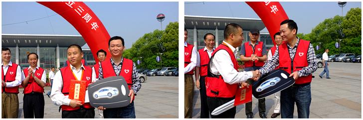 启动仪式上,率领“延续队”参与本次爱心招募竞赛的服务队三队队长黄建军还收到了一份来自他工作单位的特殊礼物——“恒力电机社会贡献奖”荣誉称号以及经济型轿车一辆。据杭州恒力电机制造有限公司总经理黄晨介绍,鼓励员工积极投身社会公益活动,是他们建设企业文化、打造企业核心价值观的一项重要内容。希望员工在参与社会公益活动的过程中,润物细无声般地陶冶情操,修炼品格,进而提升自身的素质。作为恒力的员工,黄建军除了在工作中表现出色外,从1997年开始定期参加无偿献血,累计献血55次,献血总量达23000ml,同时,他还积极投身无偿献血志愿服务工作,长期利用个人休息时间坚持参与无偿献血的宣传、招募和服务工作,累计参与无偿献血志愿服务时间超过1200小时,正因为他常年的无私奉献,使许许多多在死亡边缘上挣扎的病人获得了重生的机会,让许许多多家庭有了再次团聚的机会。为了表彰黄建军同志的优秀事迹,黄晨总经理特别为他签发了公司嘉奖令,授予黄建军同志“恒力电机社会贡献奖”荣誉称号,并奖励经济型轿车一辆,这是这家企业对参与社会活动者的最高褒奖,弥足珍贵。