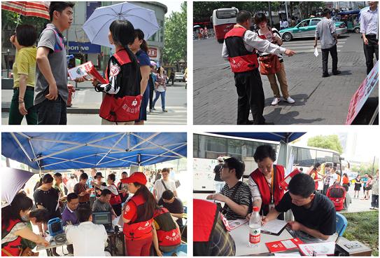 5月的天气真的非常暖人,气温达到31℃。参赛 4支队伍的全体成员在协会郝玮宸、金黛华等副会长的带领下,不畏日晒,奔赴在各个献血点进行现场宣传招募,队员们各个激情洋溢。如:下沙献血点离市中心较为偏远,因此平时来献血的人较为稀少,但这天在志愿者们的爱心传递下成绩斐然,成功招募献血人数50人,采血量为17000ml; 武林广场成功招募献血人数88人,采血量为27600ml; 吴山广场上有一部分志愿者用手语表演的形式吸引了不少过路的市民驻足而观,而另一部分志愿者们则负责现场解说。成功招募献血人数60人,采血量为18630ml;龙翔采血点成功招募52人,采血量为13230ml。当天成功招募献血者共计250人,总计采血量为76460ml。